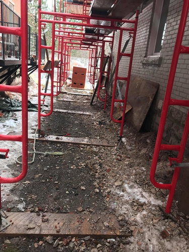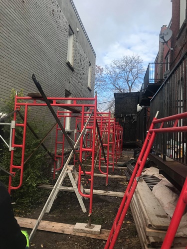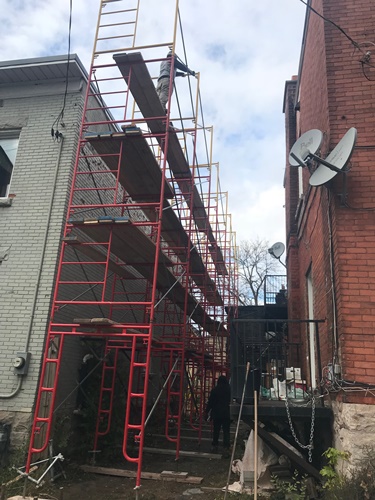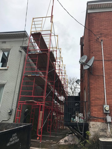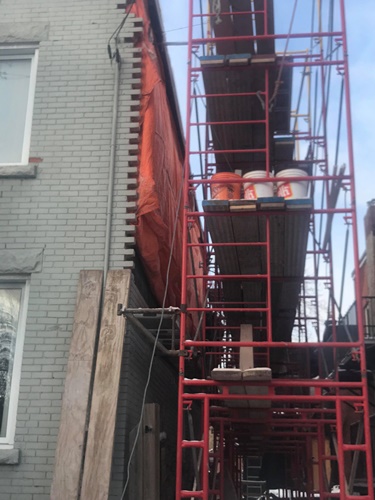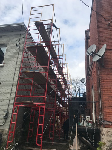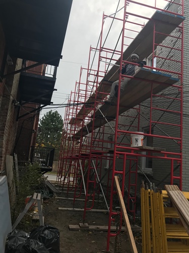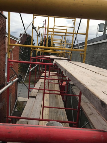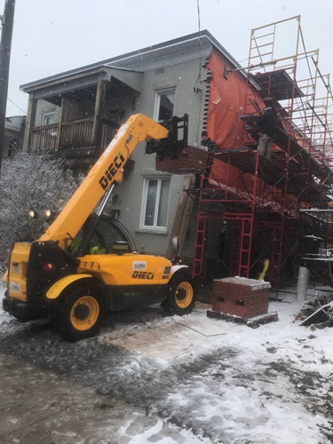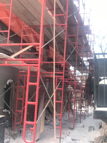 Minus twenty below zero and late into the evening Donovan Masonry working steady by heating sand to eliminate freezing. Several heaters are installed and in this freezing weather we actually are working in our T-shirts. Very warm when you cover your scaffold as such. We have been in business for 43 years and invested heavily into all the proper equipment to take care of your masonry needs. We also rent and erect scaffold for homeowners who are hands on but need to be able to work at heights and also scaffold erections for residential construction or maintenance companies.